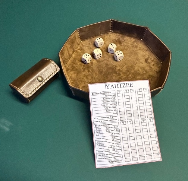 Un jeu de Yahtzee ou Yams personnalisable avec l’élégance du cuir Présenter un jeu entièrement en cuir est élégant, facile...