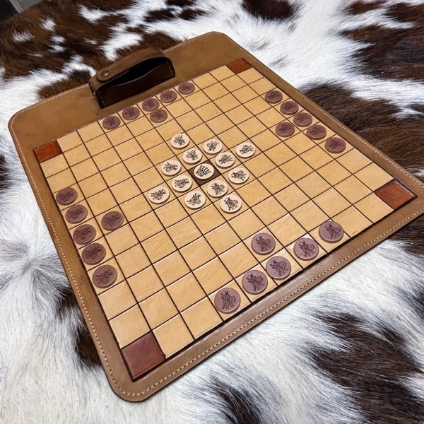 Hnefatafl ou Fetlar est le jeu des Vikings. Ce jeu de stratégie est réalisé entièrement en cuir avec un plateau souple et une réserve de pions incorporé. Cette structure souple et légère permet un transport facile et un rangement aisé, il peut être enroulé.